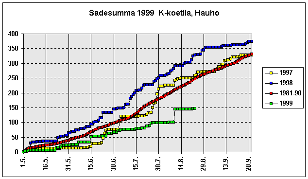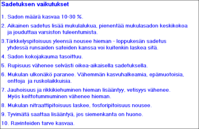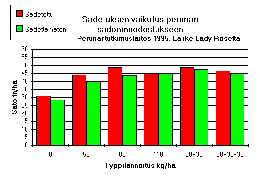 Vuonna 1995 hyöty oli PTL:n kokeissa vähäisempi, mutta silloin perunaa sadetettiinkin vain 47 millin vesimäärällä ja sadetus lopetettiin jo elokuun alussa. Hyvin myöhäisestä istutusajankohdasta johtuen sadonmuodostus kuitenkin keskittyi 1995 nimenomaan elokuulle, joka oli Hämeessä viimeistä viikkoa lukuunottamatta täysin sateeton . Peruna olisi luonnollisesti tarvinnut runsaasti vettä juuri silloin. Hyvä vesitalous vaikuttaa sadonlisäyksen ohella myöskin monella muulla edullisella tavalla perunan laatuun.