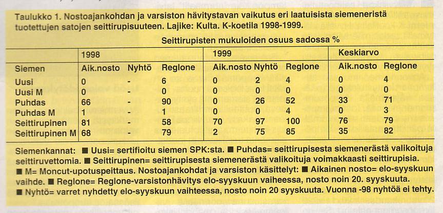 muodostuu enemmän kuin kuivina. Seittikokeiden kokemuksia Seittiruven muodostumista on seurattu osana kahta erillistä K-koetilalla järjestettyä seittitutkimusta vuosina 1998-2000. Vertailtaessa eri alkuperää olevia siemeneriä nähtiin selvästi, että uudella Siemenperunakeskukseen siemenkannalla tuotettuun satoon tuli hyvin niukasti seittirupea ja jos siemen lisäksi peitattiin tai nosto suoritettiin riittävän aikaisin, seittiruvelta vältyttiin kokonaan (Taulukko 1). Tyrnävän siemen oli siis molempina koevuosina lähes kokonaan vapaata seittitartunnasta. SPK:n tuottamasta siemenestä on samanlaisia hyviä kokemuksia usealta vuodelta myöskin kun sitä on käytetty perunan normaaleissa lajikekokeissa. Sen sijaan seittirupista siementä käytettäessä seittirupea oli sadossa aina runsaasti, 60-100 %:ssa mukuloista, riippumatta nostoajankohdasta, varsistonhävityksestä tai vuodesta. Seittirupisen siemenen peittaus yhdistettynä sadon aikaisen noston kanssa vähensi seittirupisten mukuloiden osuutta vuoden -99 kuivissa olosuhteissa, muttei sateisena kesänä -98. Siis jos siemenperunassa on seittirupea, sen siirtymistä uuteen satoon ei voi estää pomminvarmasti oikein millään toimenpiteellä. Kun siemenenä käytettiin seittirupisesta erästä valikoituja seittiruvettomia mukuloita, joissa siis edelleen oli seittitartuntaa mutta vain piilevänä rihmastona, ja siihen yhdistettiin siemenen peittaus, seittiruvesta päästiin molempina koevuosina lähes kokonaan eroon. Seittirupea muodostui yhtä vähän kuin uuteen SPK:n siemeneen. Jos peittausta ei suoritettu, jäi siemenperunaan selvästikin runsaasti piilevää saastuntaa, joka siirtyi uuteen satoon seittiruveksi. Tässäkin tapauksessa seittirupea muodostui sateisena kesänä -98 runsaammin ja aikaisemmin kuin kuivana vuonna -99. Siis jos siemenperunassa on seittirupea, niin myöskin erän seittiruvettomat mukulat selvästikin lisäävät osaltaan seuraavan sadon seittirupisuutta. Joissakin olosuhteissa ja oikealla viljelytekniikalla voidaan piilevä saastunta tosin onnistua pitämään kurissa ja aikaansaadaan lähes seittiruveton sato. Vuoden 1999 seittikokeessa tutkittiin lisäksi eri varsistonhävitystapojen vaikutusta seittirupisuuteen. Läpi linjan varsiston nyhtö oli jonkin verran parempi vaihtoehto kuin Reglone-käsittely, mutta aikainen nosto antoi selvästi nyhtöäkin varmemman tuloksen. Nyhtö
