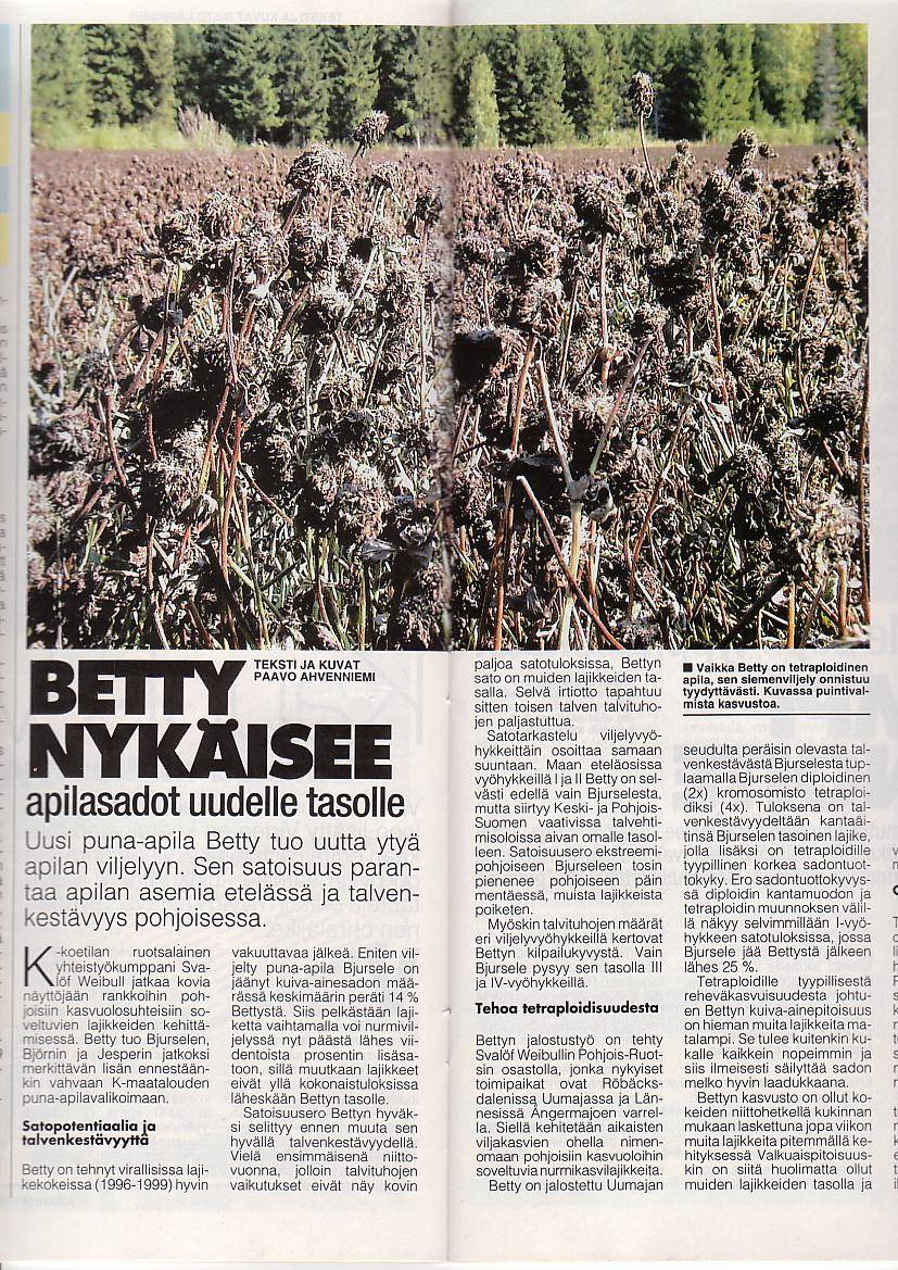 Betty nykäisee apilasadot uudelle tasolleAhvenniemi, P. Maatilan Pirkka 2000(2):26-27. Uusi puna-apila Betty tuo uutta ytyä apilan viljelyyn.Sen satoisuus parantaa apilan asemia etelässä ja talvenkestävyyttä pohjoisessa. K-koetilan
