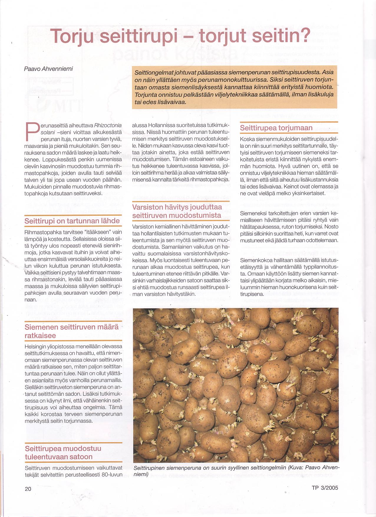 yllättäen myös perunamonokulttuurissa. Siksi seittiruven torjuntaan omasta siemenlisäyksestä kannattaa kiinnittää erityistä huomiota.