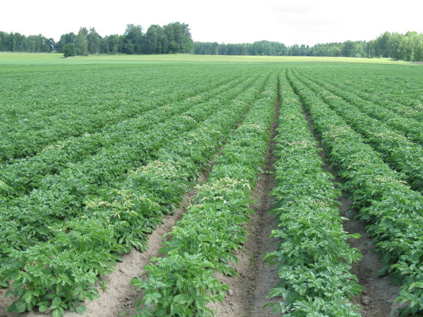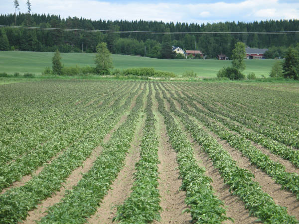 Kuva 3. Vain noin kilometrin päässä pahoin kärsineestä pellosta sama halla on ainoastaan vähän nipistänyt jo pitemmälle ehtinyttä perunakasvustoa.