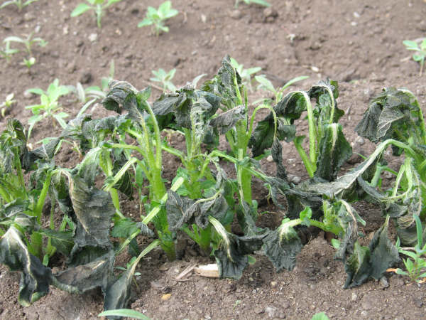 Kuva 2. Näinkin pahoin vioittuneet taimet toipuvat, mutta niiden kehitys viivästyy muutaman viikon ja niiden kasvutapa muuttuu runsaan sivuverson muodostuksen vuoksi.