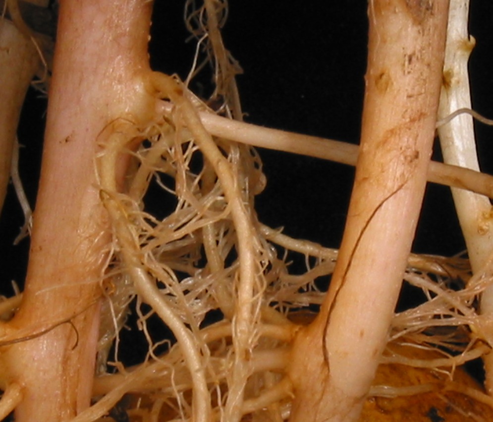 Oheisen kuvan 1 olen ottanut ensimmäisestä havainnostani perunan varsien tyvellä kasvavasta ruskeasta rihmastosta. Kun pesin ensimmäisenä kesänäni Viikin Kasvipatologian laboratorioilla pellolta seittikokeesta nostamiani kasveja kraanan alla, huomasin äkkiä, että varsien tyvestä ei irtoakaan pelkästään multaa, vaan myös jotakin ruskeaa, jonka alta paljastuu puhtaampaa vaaleaa vartta. Varren tyvi oli selvästi jonkinlaisen ruskean verkon kattamaa, joka irtosi, kun hieraisin pintaa peukalolla. Olin löytänyt seittiverkon! Myöhemmin havaitsin, että seittiverkko ei kata pelkästään seittisten kasvien varsien tyviä, vaan sitä on kaikkialla perunan maanalaisissa osissa: maavarsissa, mukuloissa ja juurissa. Kuvan terveen ja seittisen kasvin juurien värierosta olen esittänyt jo seittistoorin edellisessä osassa, mutta menköön tässä uudestaan,niin puhutteleva se on (kuva 2).